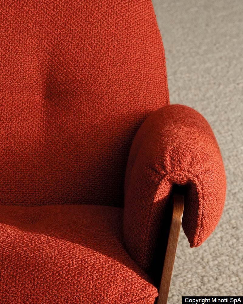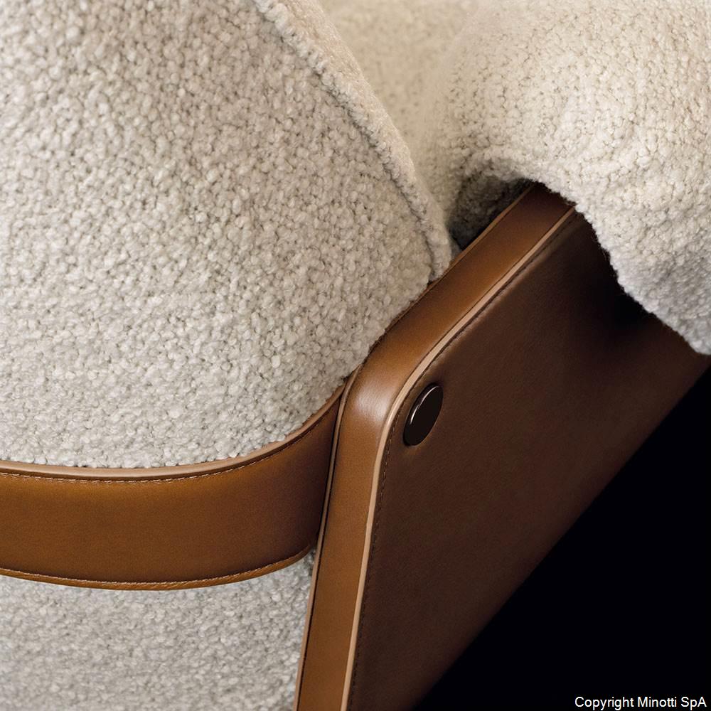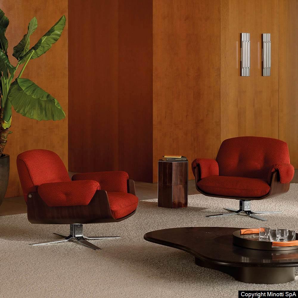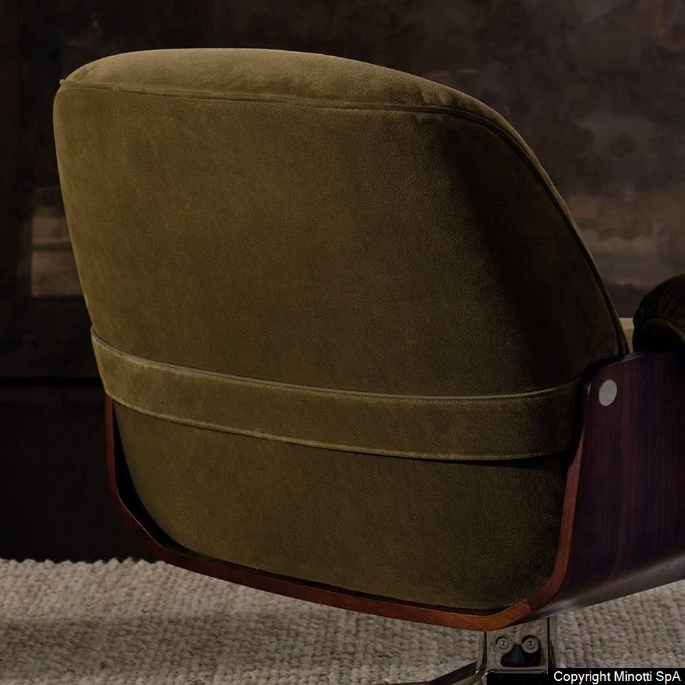 Giampiero Tagliaferri设计的扶手椅和餐椅,借鉴了上世纪中叶现代风格的造型与美学元素,打造出与众不同的隽永之作。 座椅的基壳可选用木制材质或皮革覆面,细腻的缝线工艺令座垫与靠垫倍显精致,基壳结构向上延展,自然承托起柔软的扶手。 扶手椅的背面设计别具个性,一条织物或皮革饰带点缀其间,由基壳两侧的金属扣加以固定,这一精致细节也沿用在餐椅的设计中。 旋转式扶手椅和脚凳的基座采用金属辐条结构,辐条弯折成型后与垂直立柱固定在一起;餐椅则搭配纤细的金属椅腿,造型更为轻盈。