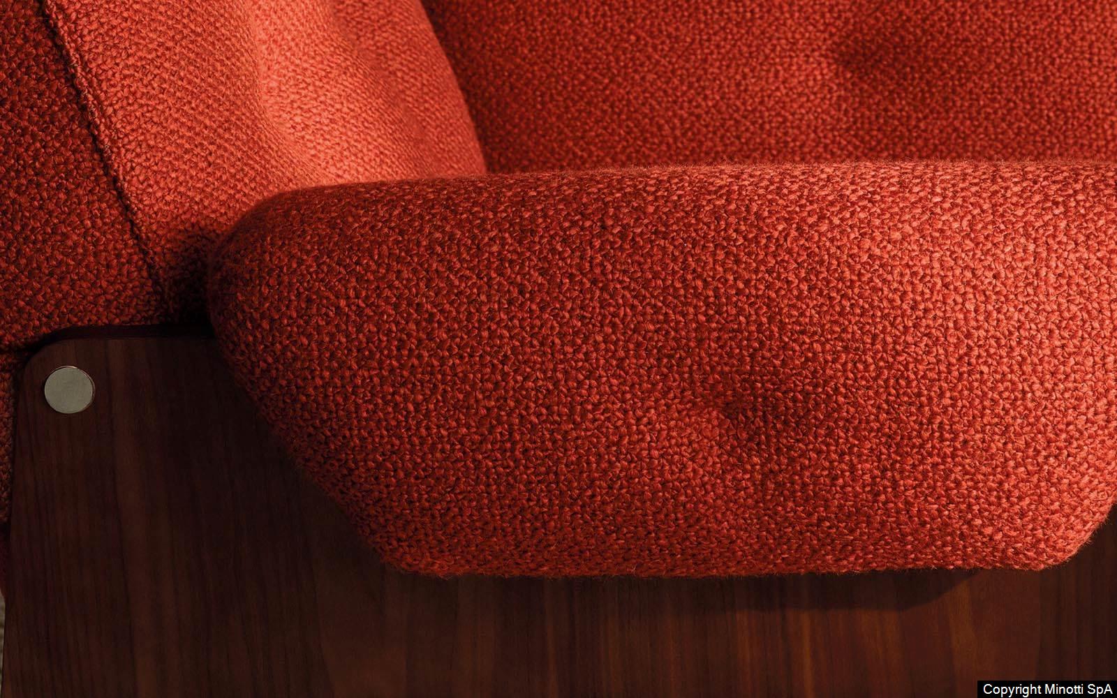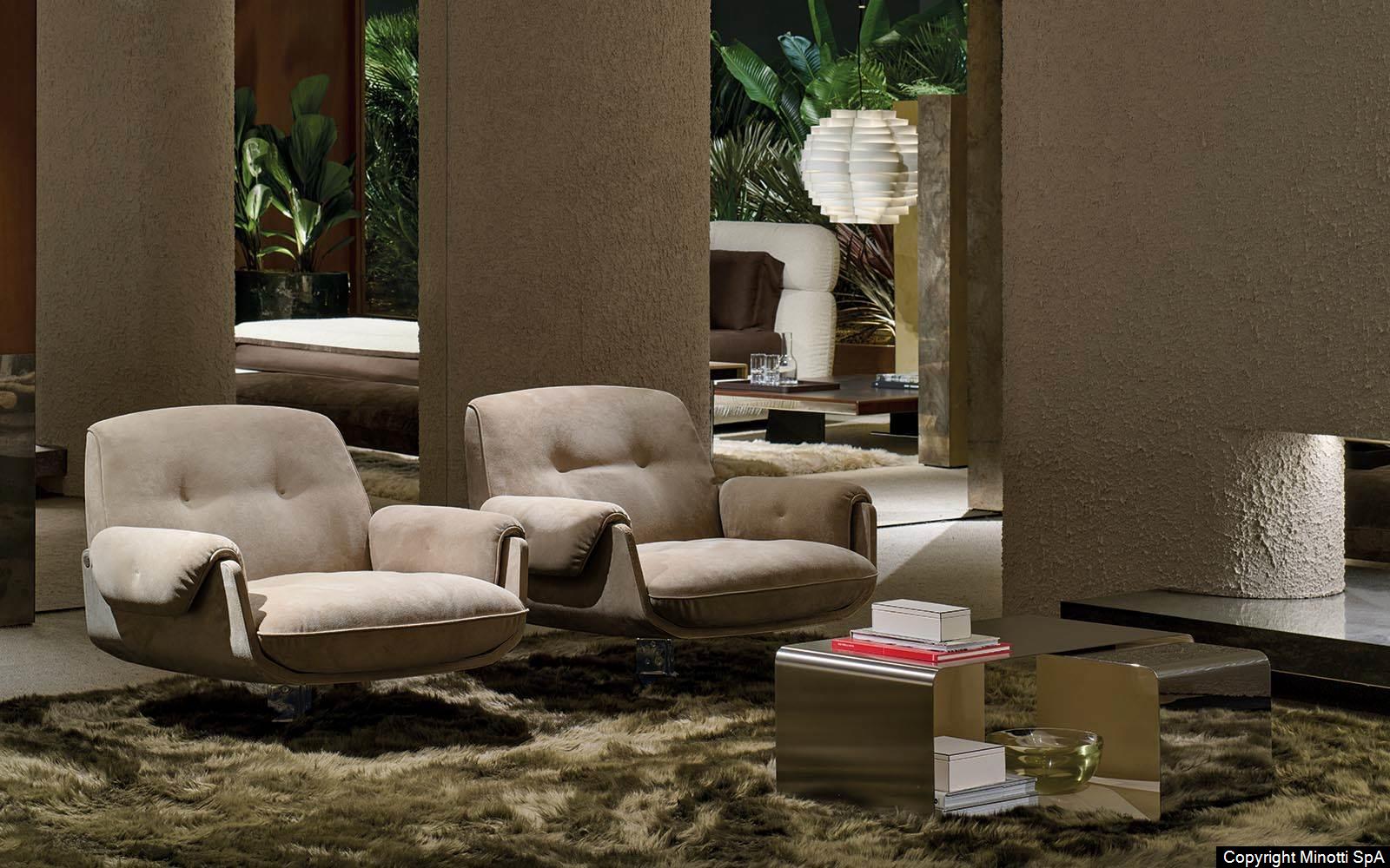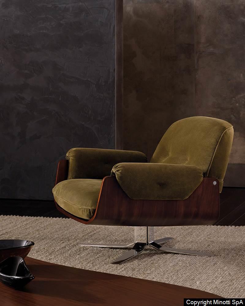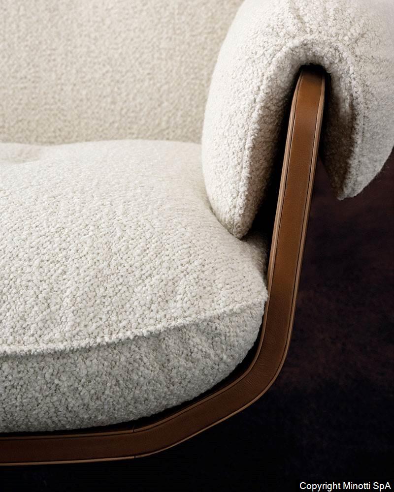 Giampiero Tagliaferri设计的扶手椅和餐椅,借鉴了上世纪中叶现代风格的造型与美学元素,打造出与众不同的隽永之作。 座椅的基壳可选用木制材质或皮革覆面,细腻的缝线工艺令座垫与靠垫倍显精致,基壳结构向上延展,自然承托起柔软的扶手。 扶手椅的背面设计别具个性,一条织物或皮革饰带点缀其间,由基壳两侧的金属扣加以固定,这一精致细节也沿用在餐椅的设计中。 旋转式扶手椅和脚凳的基座采用金属辐条结构,辐条弯折成型后与垂直立柱固定在一起;餐椅则搭配纤细的金属椅腿,造型更为轻盈。