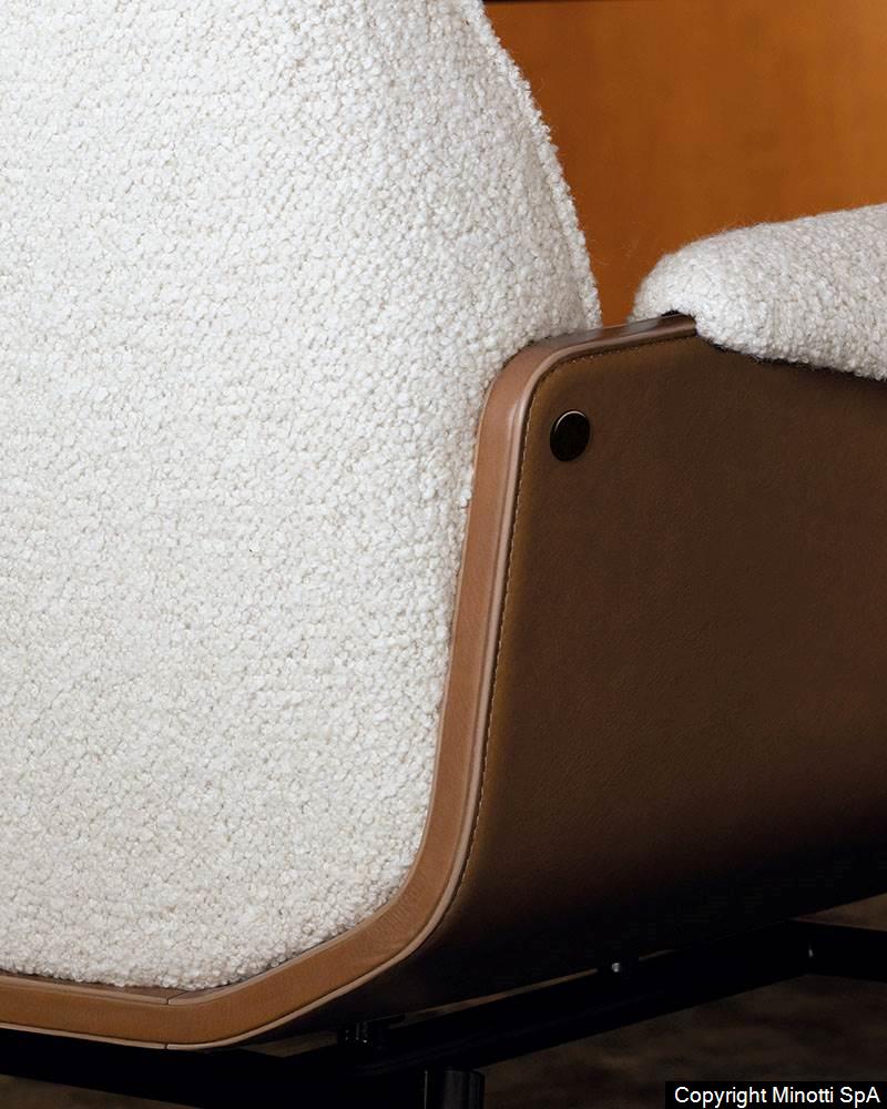 Giampiero Tagliaferri设计的扶手椅和餐椅,借鉴了上世纪中叶现代风格的造型与美学元素,打造出与众不同的隽永之作。 座椅的基壳可选用木制材质或皮革覆面,细腻的缝线工艺令座垫与靠垫倍显精致,基壳结构向上延展,自然承托起柔软的扶手。 扶手椅的背面设计别具个性,一条织物或皮革饰带点缀其间,由基壳两侧的金属扣加以固定,这一精致细节也沿用在餐椅的设计中。 旋转式扶手椅和脚凳的基座采用金属辐条结构,辐条弯折成型后与垂直立柱固定在一起;餐椅则搭配纤细的金属椅腿,造型更为轻盈。