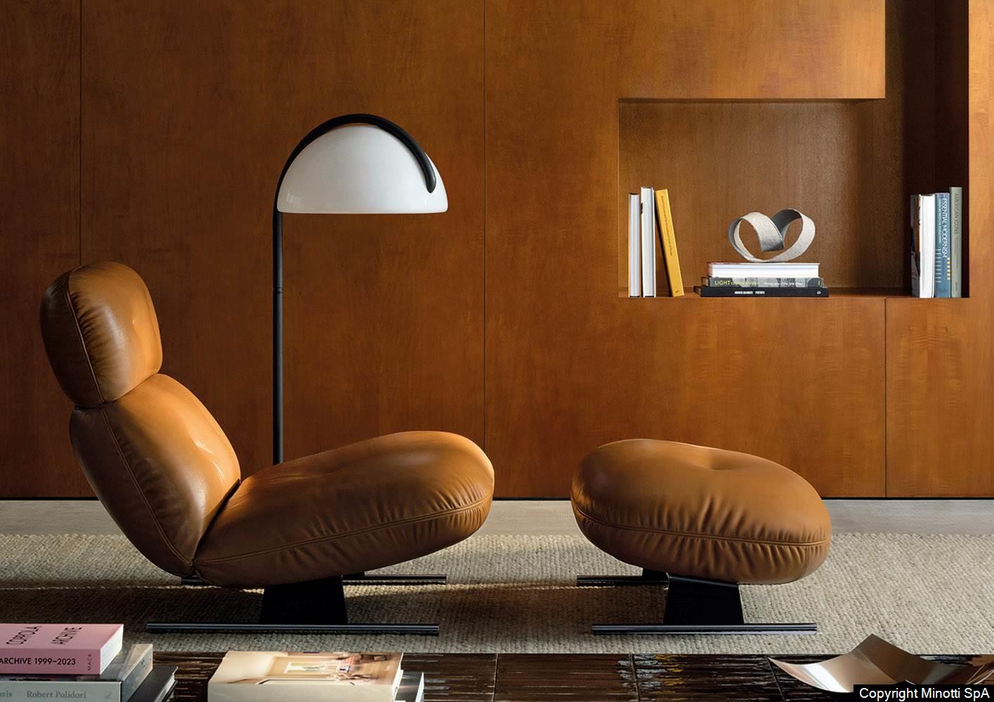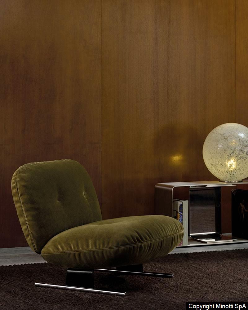 Giampiero Tagliaferri设计的Libra扶手椅,灵感源自70年代的美学风格,扶手椅由座垫、靠背和头枕叠合而成,呈现出柔和的造型,覆面材质可选用皮革或织物,中央点缝工艺精致考究,不仅增强了三维立体感,也彰显出细腻的匠心工艺。 这款作品旨在演绎造型之间的平衡之美,其名称“Libra”源自拉丁语,意为“天秤”,恰如其分地诠释出作品的设计理念。围手椅、扶手椅、椅凳、餐椅在软垫边缘饰以精致的褶裥元素,搭配利落的镶边设计,巧妙平衡覆面的柔美褶纹,展现出精湛的手工艺。别具一格的金属基座由管状金属支脚和弧形金属板构成,坚实地承托起座椅。