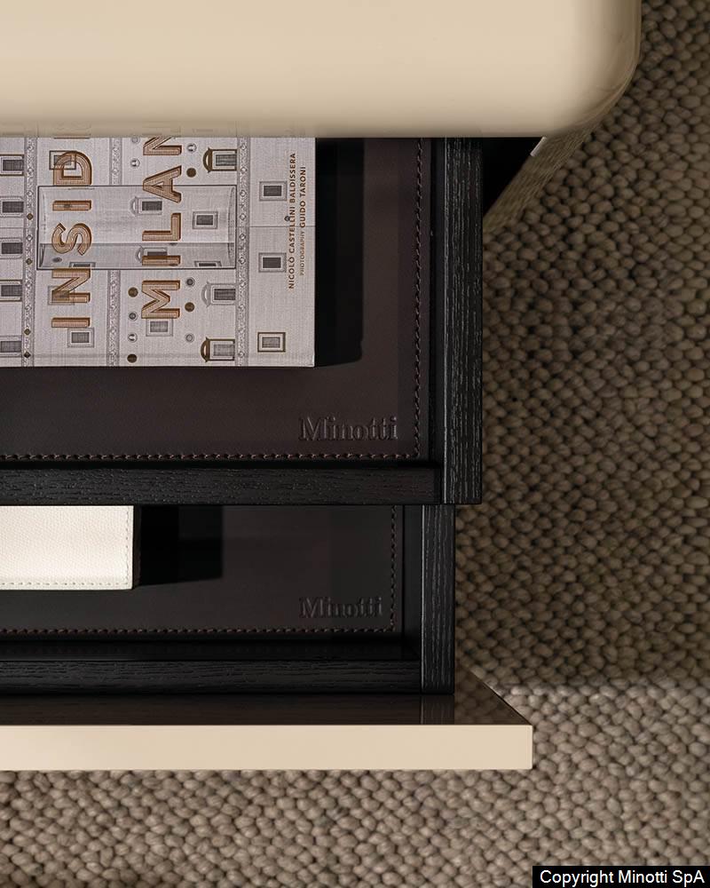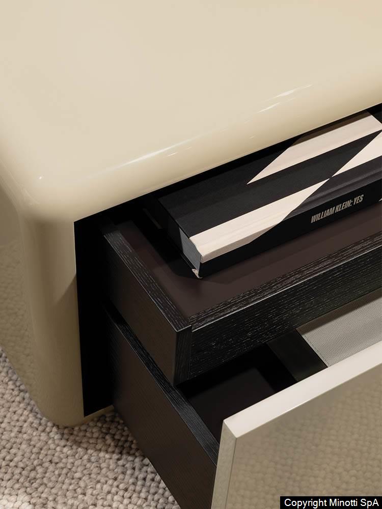 Fill床头柜与卧室收纳家具系列延续了同名边几系列的设计风格,采用无棱角的一体式造型加以呈现。 家具配有主抽屉,内部设有隐藏式小抽屉,用于收纳小物件,两者均采用皮革覆层,有不同颜色的漆面可供选择。 Fill家具作品的简约造型呈现出雕塑般的美感,光线在漆面上流转,营造出丰富的层次与光影变化。