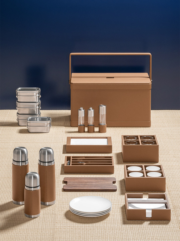 Giobagnara 爲 Poltrona Frau 打造的野餐籃是一款奢華配件,非常適合在春日美好時光中享受戶外早餐。其配備可傾斜手柄,便于携帶,尺寸爲 54 × 35 × 35 cm,外部采用多種顔色的 Pelle Frau® SC ColorSphere® 皮革包覆,幷輔以卡納萊托胡桃木細節。野餐籃內含: - 4只透明硼矽玻璃杯 + 2個保溫壺 - 1塊木質砧板 + 2個金屬食品儲存盒 - 1個金屬餐具盒 + 1個鹽罐 + 1個胡椒罐 - 4人份刀叉勺與餐盤套裝