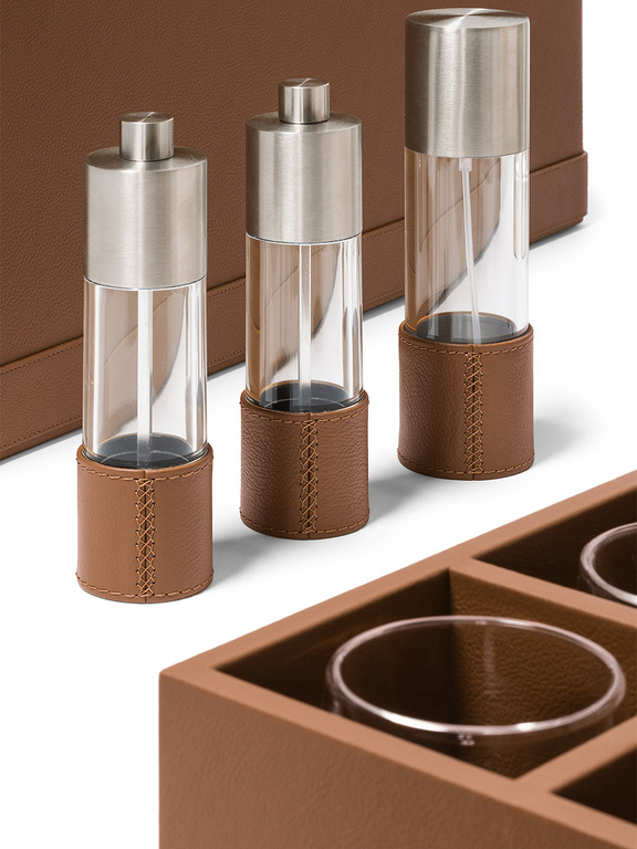 概念與設計:Beautilities 系列彙集了許多用于點綴我們生活的日常用品和飾品,使各種環境和情形下的每個時刻都變得更加愉悅,比如餐桌、辦公室、戶外空間或與寵物的聯繫。每一個細緻的小奢華都散發著舒適的氛圍,每一次看見、觸摸或經過它,都能讓我們感受到幸福的涌動。 與Giobagnara聯名出品的餐具系列Tableware Collection是一個餐桌組合配件系列,即使只是一頓簡單的晚餐,也可平添一抹精緻高貴的氣息。該系列提供多款優雅實用的單品,爲就餐體驗錦上添花,全部以Pelle Frau®皮革包裹,每一個細節都經過精心手工處理。餐桌系列配件營造了溫馨和睦的氛圍,熱情好客的感覺,流露著對他人的愛護與關心,讓餐桌前共度的每一刻更賞心悅目。