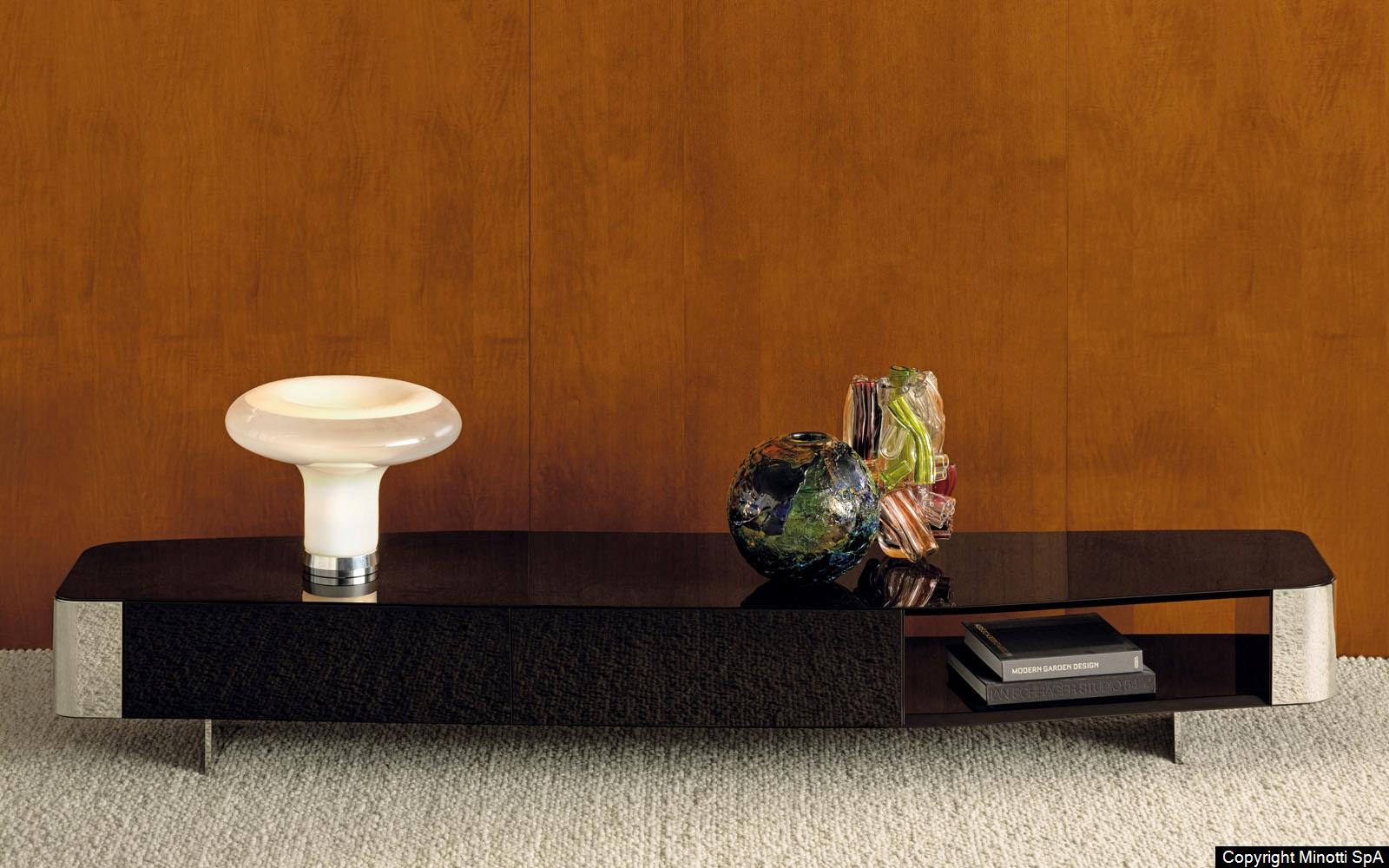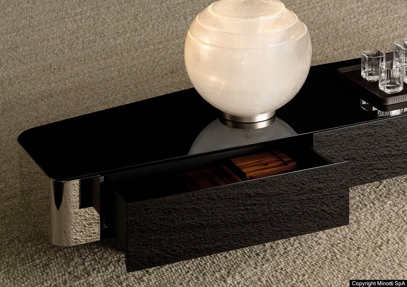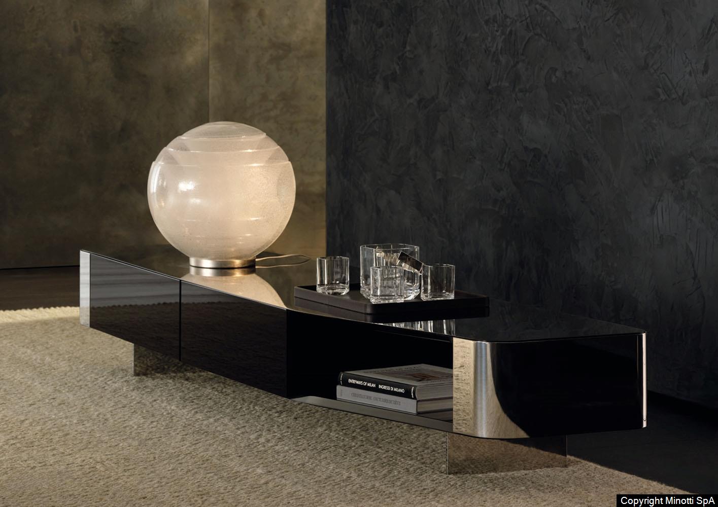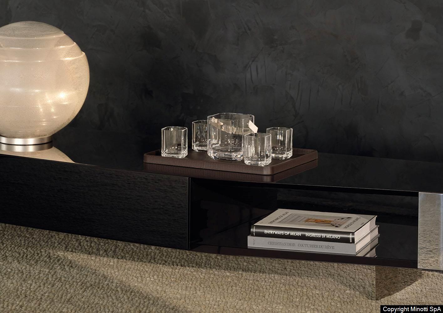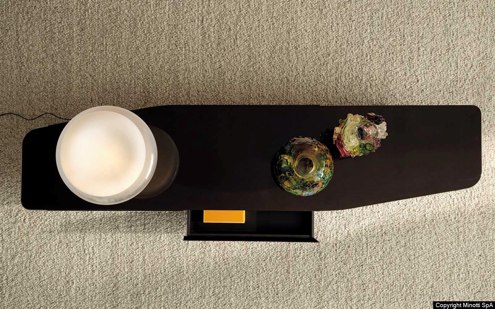 Giampiero Tagliaferri设计的Diagramma边几系列衍生出一款富有当代美感的收纳家具。 不规则的多面造型赋予其雕塑般的美感,使其成为客厅空间中的视觉焦点。 三个亮光不锈钢弧形部件,承托起亮光漆面的整体结构,其中配备抽屉和开放式格柜,进一步提升家具的功能属性。这组收纳家具系列的标志性元素是在两侧短边嵌入精致的金属饰条,赋予其独特的视觉表现力,无论是靠墙摆放,还是置于空间中央,都同样出彩。