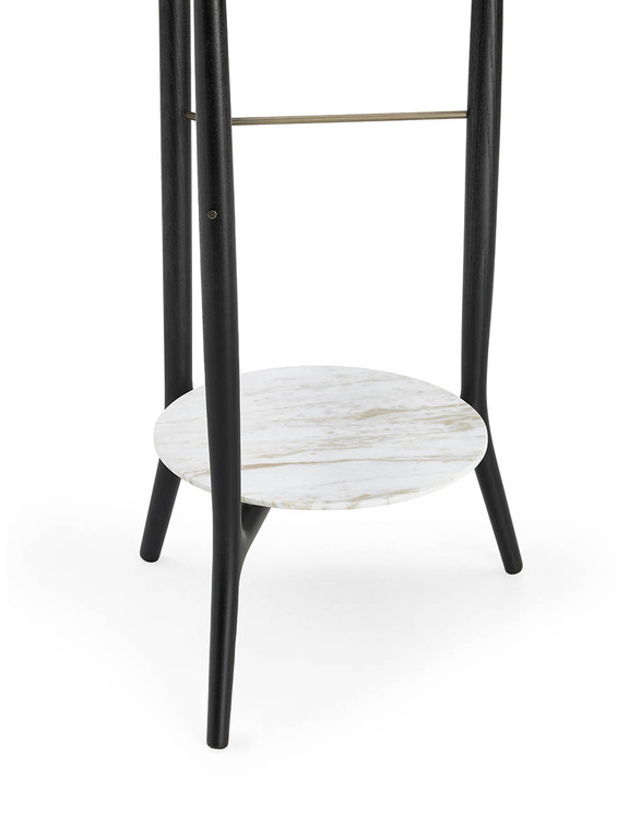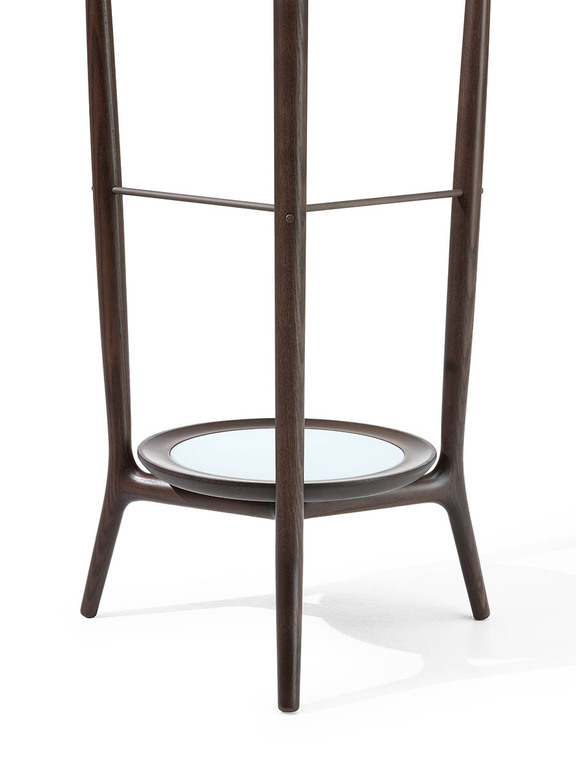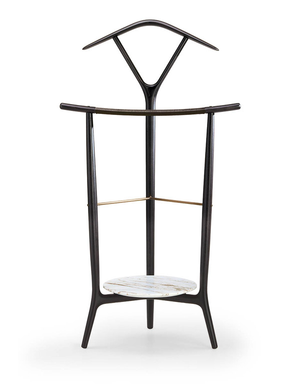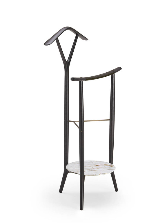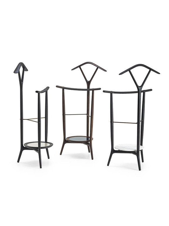 DUO 衣帽架是對 18 世紀誕生的古典 Servomuto 衣帽架的一種優雅演繹,最初用于放置賓客的衣帽。DUO 衣帽架采用白蠟木實木打造,整體由三條支柱構成:後部立柱呈 V 形分叉支撑著衣架,而前部兩條支柱則支撑著略微彎曲的褲架,其造型靈感源自日本古代武士刀的流暢曲綫。DUO 臥室衣帽架提供多種款式,以滿足不同需求。