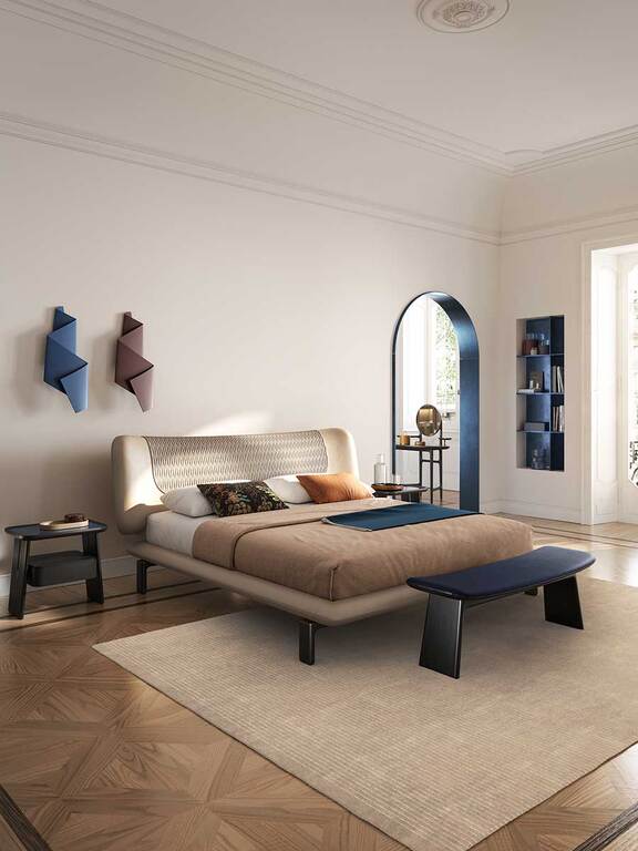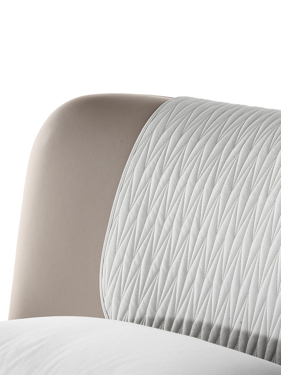 DUO 設計款床重新詮釋了 DUO 系列的經典元素,例如床頭板的流暢曲綫設計。床架采用鋼制結構,底座由椴木或黃楊木橫梁構成,幷沿整個邊緣覆蓋輕薄的填充層。懸挂式軟包床頭板超出床架寬度,呈環抱式設計,幷配有可拆卸絎縫裝飾軟墊。圓柱形床脚采用鋁制結構,表面包覆 Pelle Frau® 皮革,與床體相匹配。DUO 皮革床提供多種尺寸及飾面選擇。Poltrona Frau 標志采用燙印工藝,位于床頭板的背面。