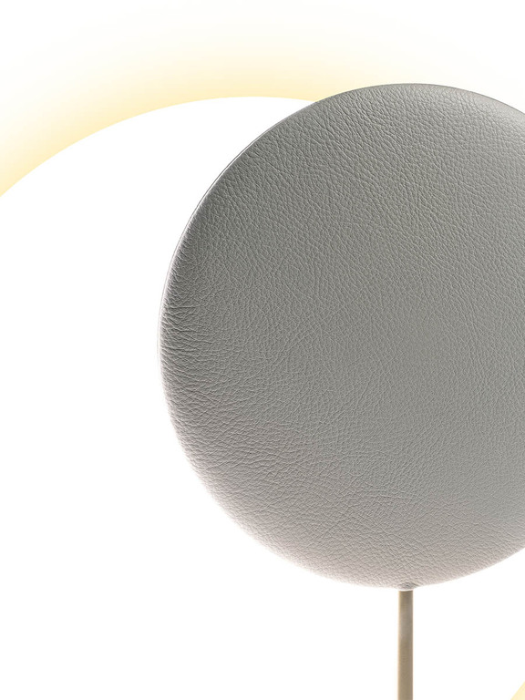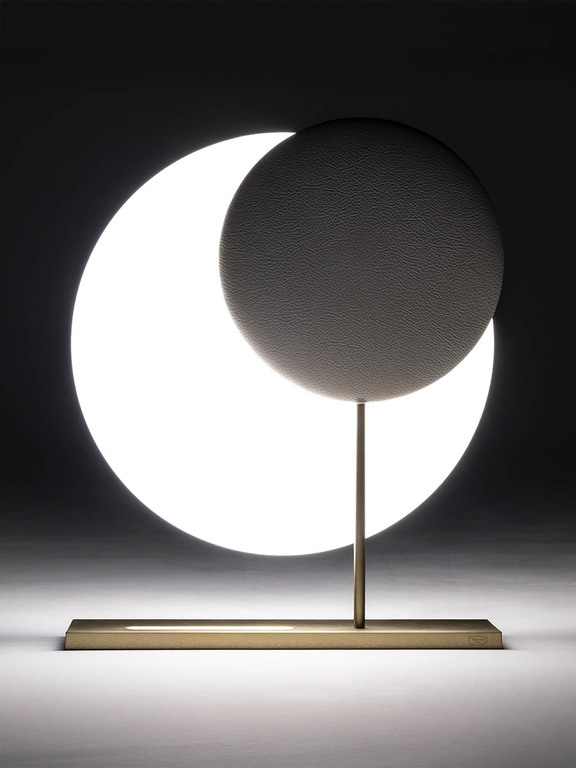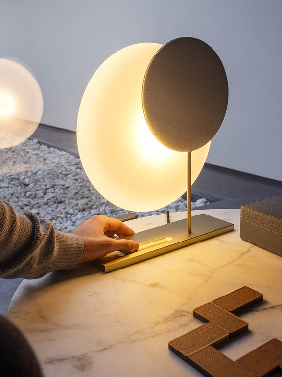 Six N. Five 桌燈以極具原創性的方式重新演繹日蝕的概念:黃銅長方形底座支撐著覆有多種顏色 Pelle Frau® 的圓盤。該圓盤部分重疊了另一個由吹製玻璃製成的較大發光圓圈。結果是一片懸浮的光,如同月牙般具有強烈情感張力,柔和地照亮並創造出富有詩意且放鬆的氛圍。此燈可調節亮度,從暖光轉為較冷光,如同月相的優雅呈現。玻璃由威尼斯玻璃大師手工吹製。吹製過程中可能出現的微小氣泡、觸感或視覺上的不規則性、微小夾雜物等,都不應視為缺陷,而是彰顯手工工藝價值及每件作品獨一無二性的特色元素。