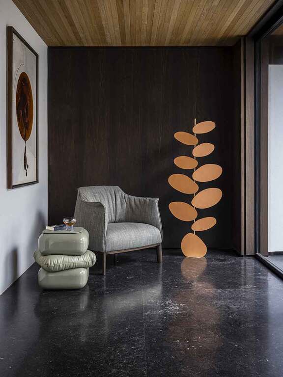 落地燈 Foliage 由 Six N. Five 設計,由黃銅底座構成,其上延展出一棵極具藝術感的“樹”,同樣采用黃銅材質,幷飾有 Pelle Frau® 皮革包裹的樹葉。得益于 Poltrona Frau 專門研發的創新系統,燈光自下而上散發,營造出葉片的“剪影”效果,幷在周圍墻面上投射出柔和的光影映照。